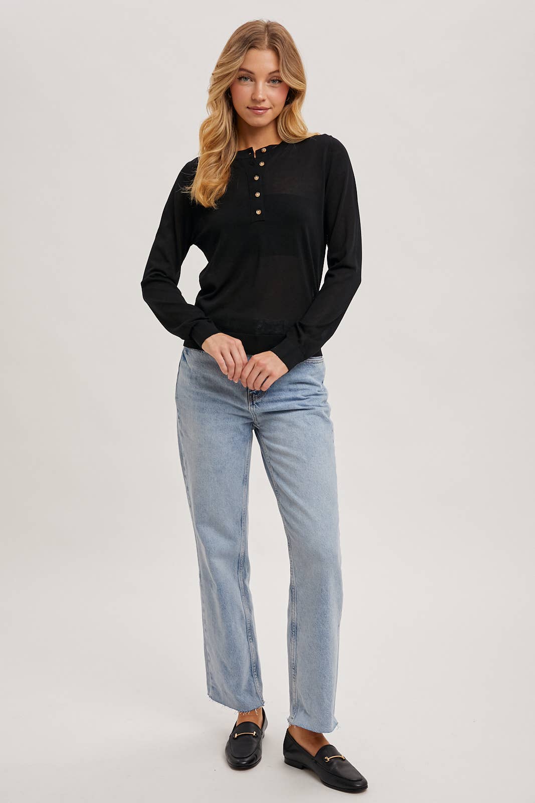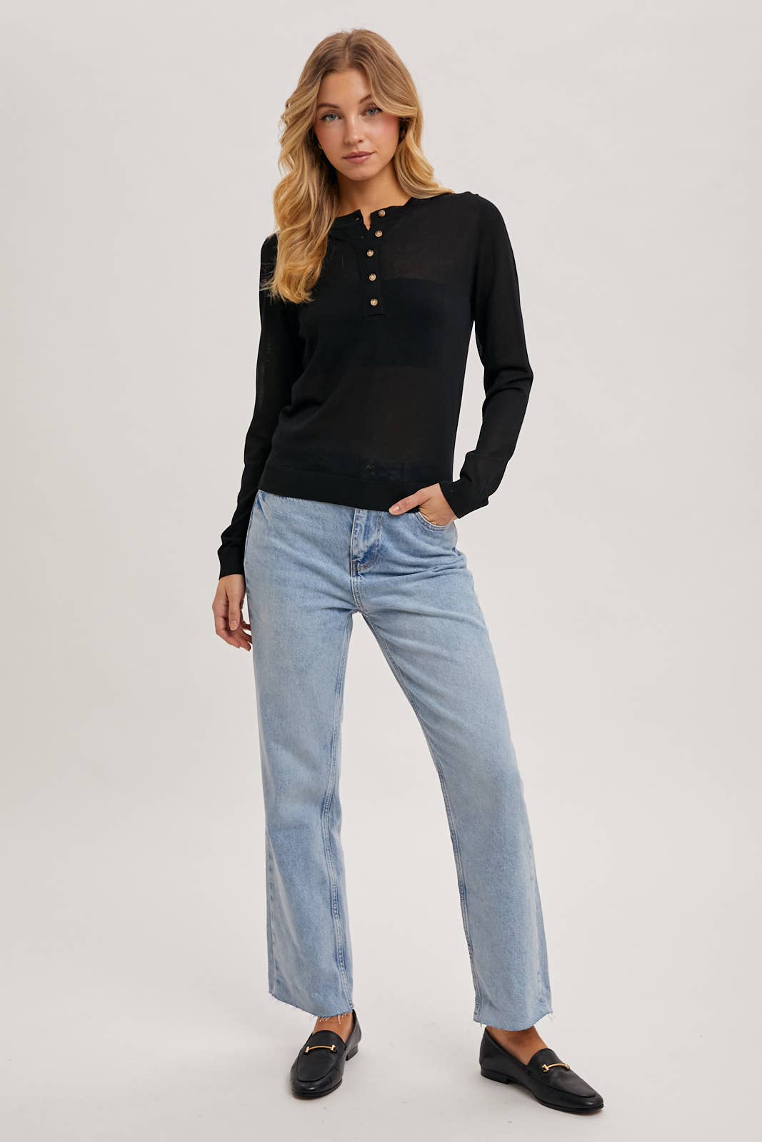 The half-button basic knit top with long sleeves is a versatile wardrobe essential, combining simplicity with subtle detail. Made from a soft, lightweight knit fabric, this top offers comfort and ease, making it perfect for layering or wearing on its own. The half-button design adds a touch of style while allowing for adjustable neckline options. Its long sleeves make it ideal for cooler weather, and the fitted silhouette complements a variety of outfits. Pair it with jeans for a casual look or tuck it into a skirt for a more polished appearance.