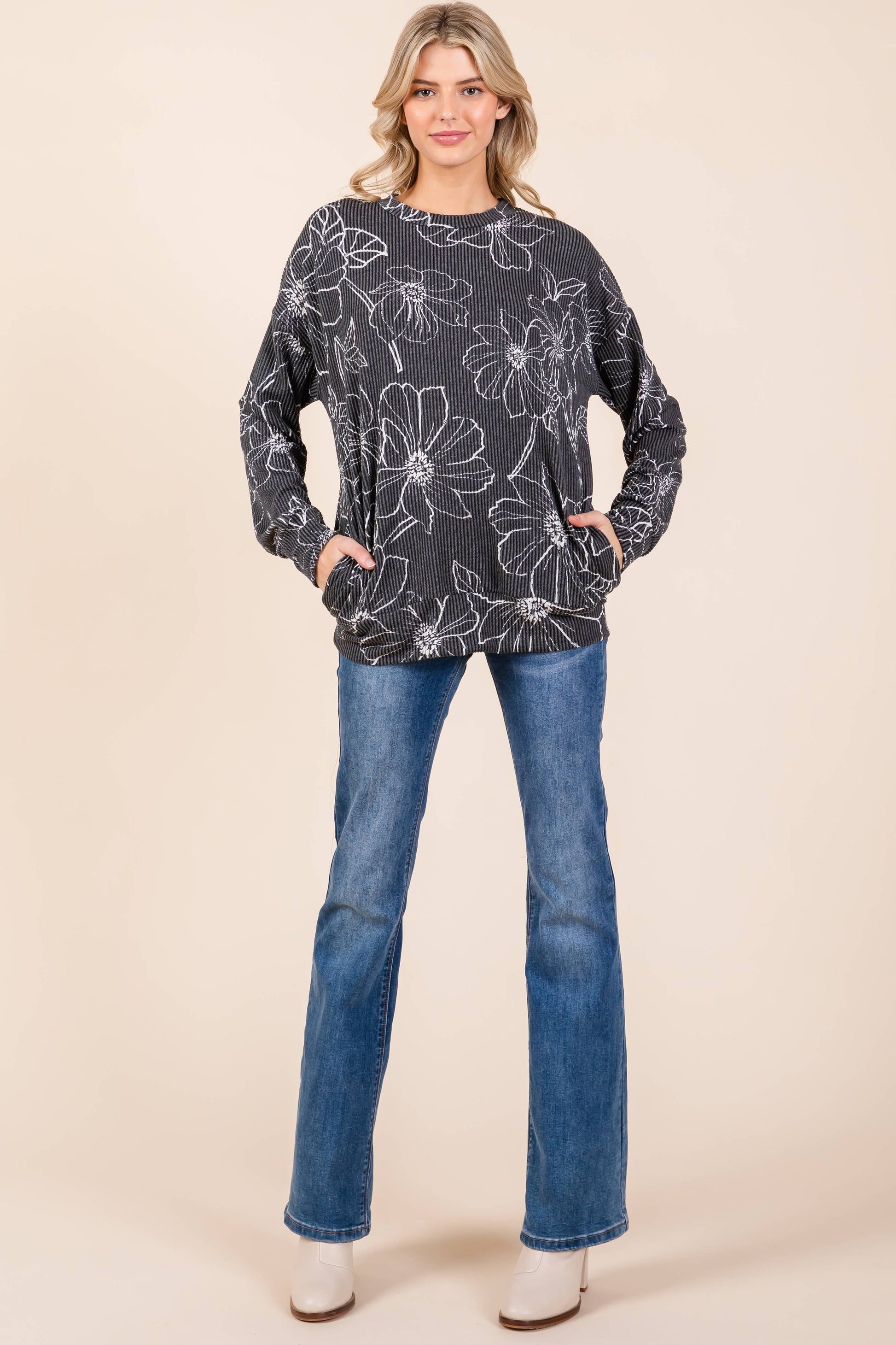 BOMBOM - Floral Sketch Ribbed Knit Sweatshirt W/pockets