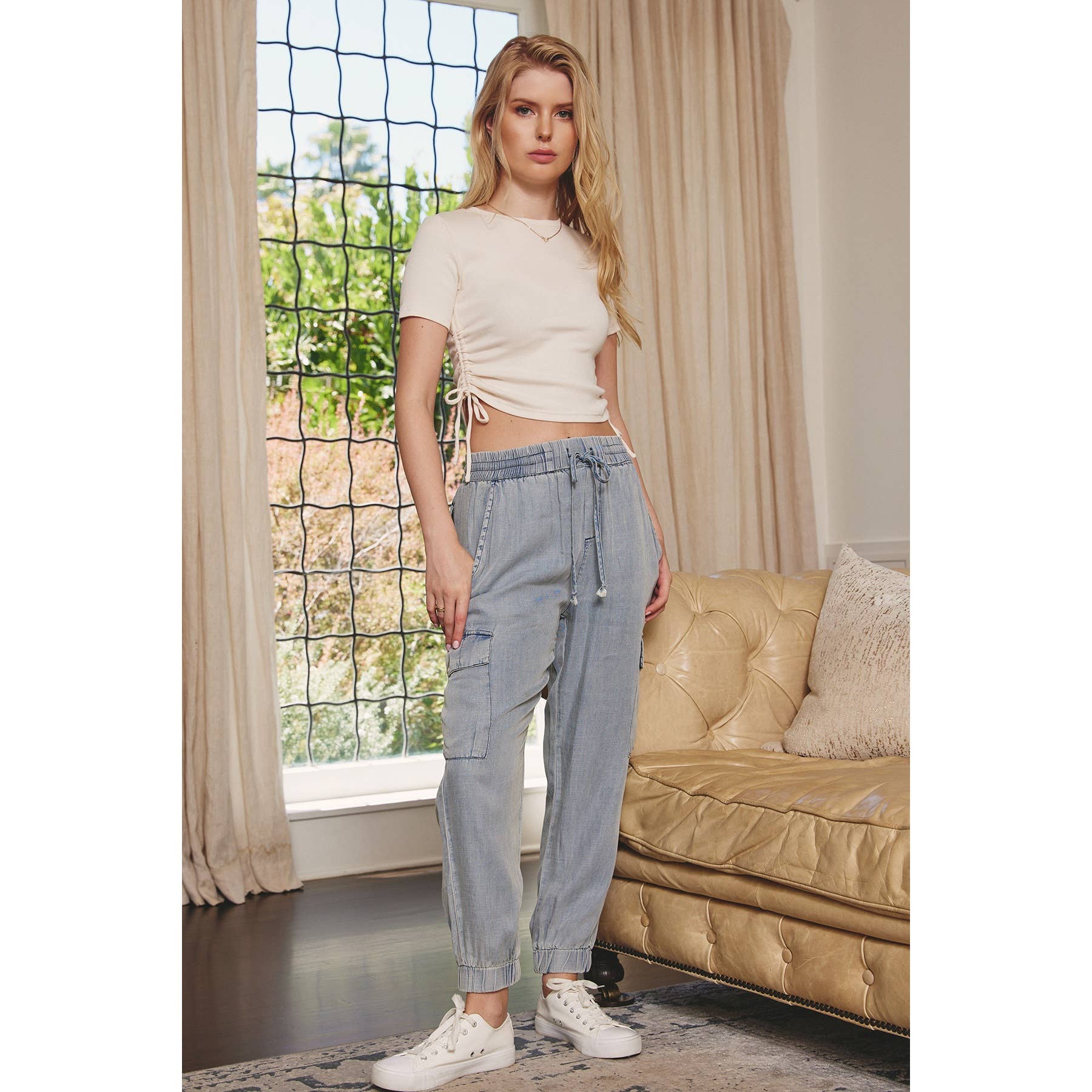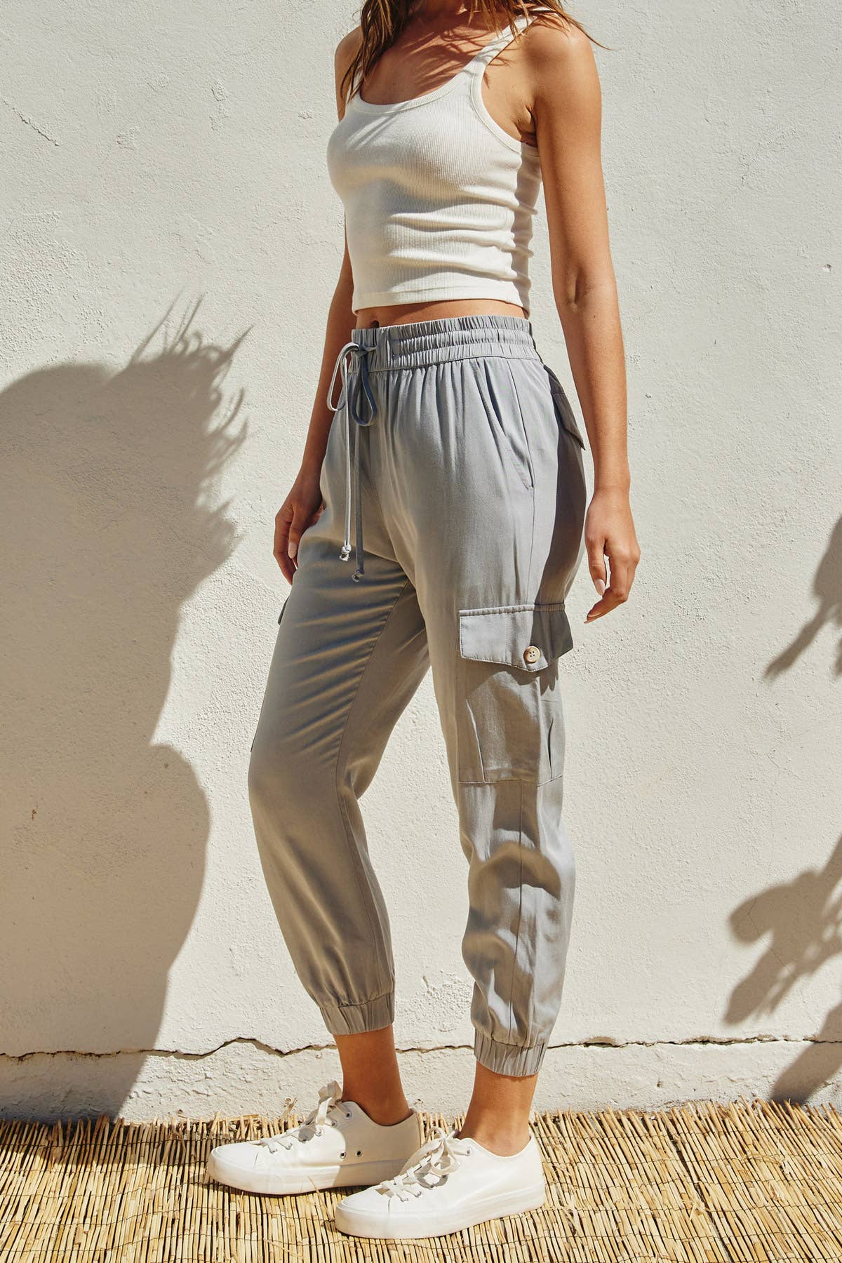 Mineral washed tencel cargo jogger pants with elasticized waistband, drawstring closure and a total of six pockets. Model in Grey is 5'9" and wearing size Small. Model with NAVY, WASHED GREY, GREY BLUE, CAMEL, PALE ROSE, RUST, BURGUNDY is 5'7' and wearing size Small. Front rise : 9 1/2" (include waistband) Inseam : 26" Shell: 100% Tencel Lining: N/A