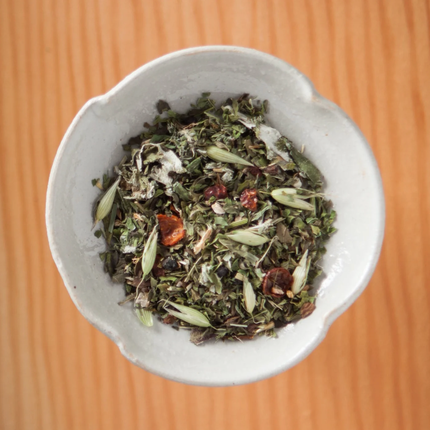 INGREDIENTS | Organic Nettles*, Organic Lemon Balm*, Organic Elder Berries, Organic Oat Straw*, Organic Rose Hips, Organic Peppermint*, Organic Alfalfa*, Organic Dandelion Root*, Organic Astragalus Root*, Organic Red Raspberry Leaf*