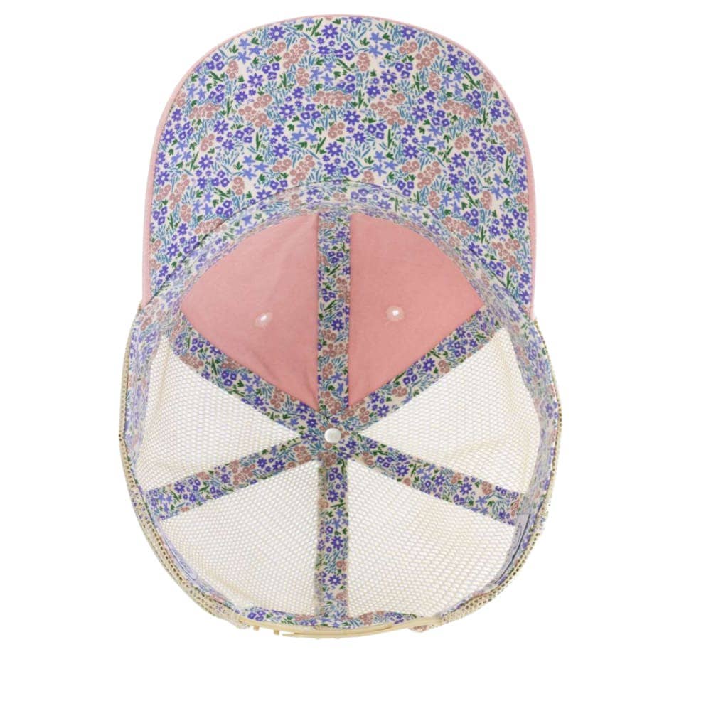 The hidden print on this Pink cap is a pink, purple and green floral print.