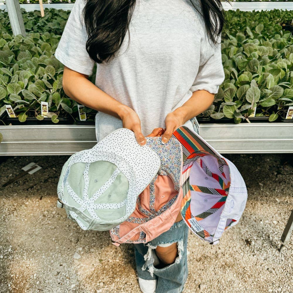 We just love these adorable hidden-print caps! Notice the fun print under the bill! There is also a top slot for your high-ponies and messy buns! The embroidered smiley on the side of the cap makes for a happy addition as well!