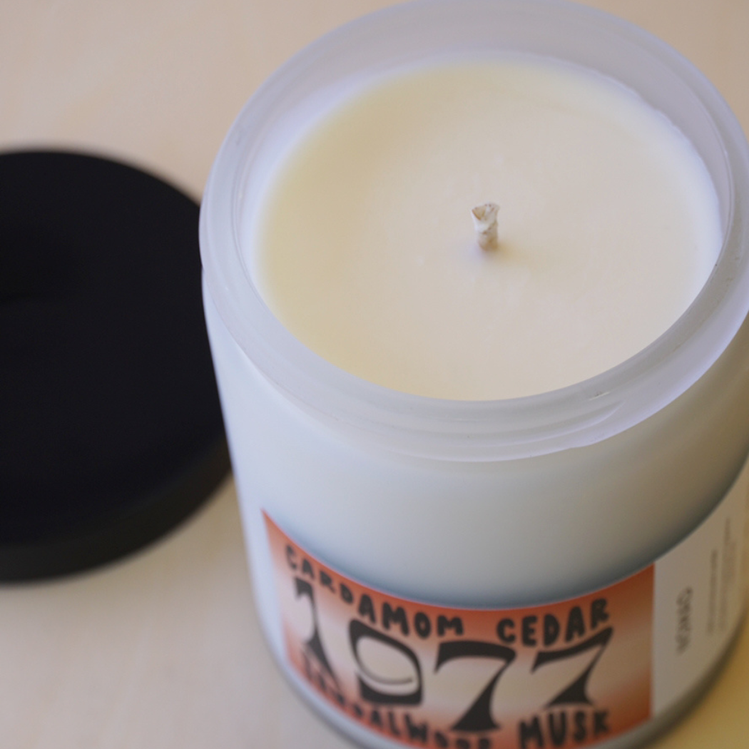 Earthy and nostalgic, 1977 will take you way, way back. Listening to Fleetwood Mac on vinyl while sprawled out on a soft shag rug, golden hour rays glinting off a suncatcher. A Laurel Canyon vibe you can burn every day. Rock + roll, but kinda chill. Notes of: Cardamom / Cedar / Sandalwood / Musk Burn time: 90 hours. No phthalates, parabens, lead, or petroleum. 100% vegan. Never tested on animals. Made in the United States of America.