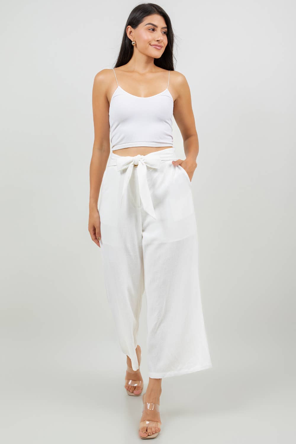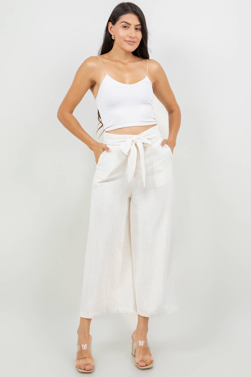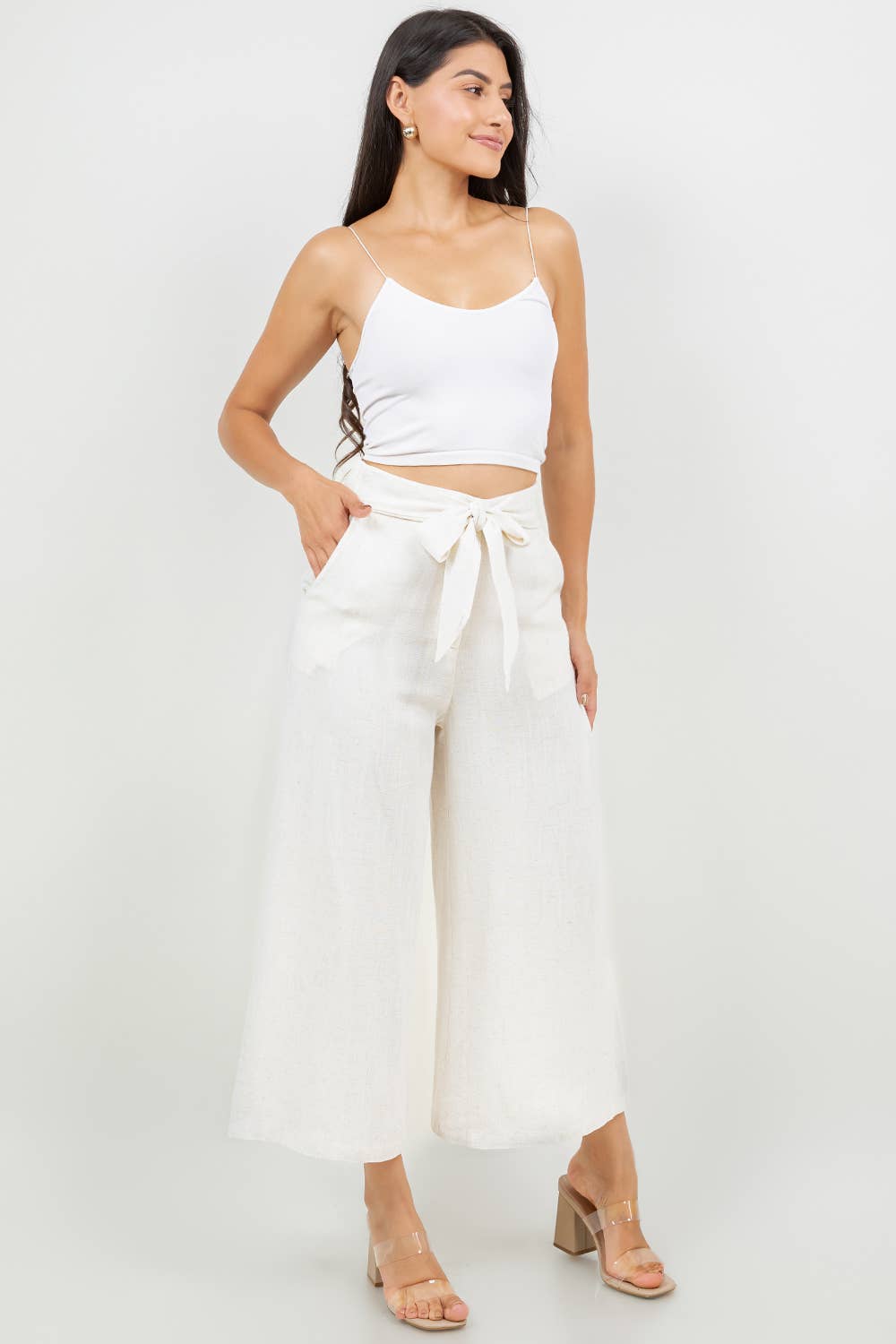 Effortlessly chic and ultra-comfortable, these wide-leg capri pants are perfect for your everyday adventures. Designed with a breezy, relaxed fit, they feature a high-waisted silhouette, a structured front waistband with an elasticized back for easy pull-on wear, and a flattering cropped length. The attached tie-front belt and belt loops add a stylish touch, while side pockets enhance practicality. Crafted from a lightweight and breathable linen-viscose blend, these culottes are the perfect blend of style and comfort.